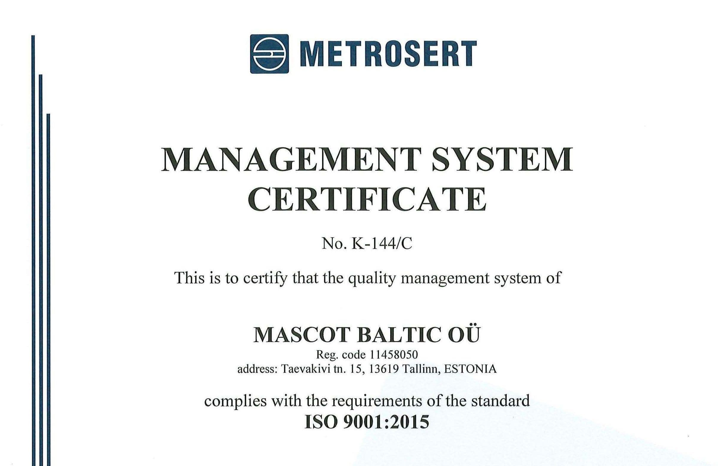 Mascot Baltic successfully passed 3-year recertification ISO-9001 audit.